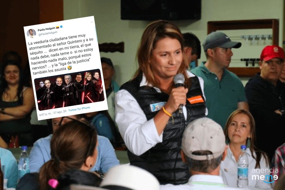 La senadora también le respondió a Daniel Quintero, que en Twitter publicó el trino original de Holguín y les reconoció “lo sinceros” al representarse como “el lado oscuro de Star Wars”. La congresista del Centro Democrático aseguró que el montaje con los villanos de la película y el título de “Liga de la Justicia” fue hecho por concejales cercanos a Quintero y que simplemente lo publicó puesto que “sabemos reírnos de nosotros mismos”.